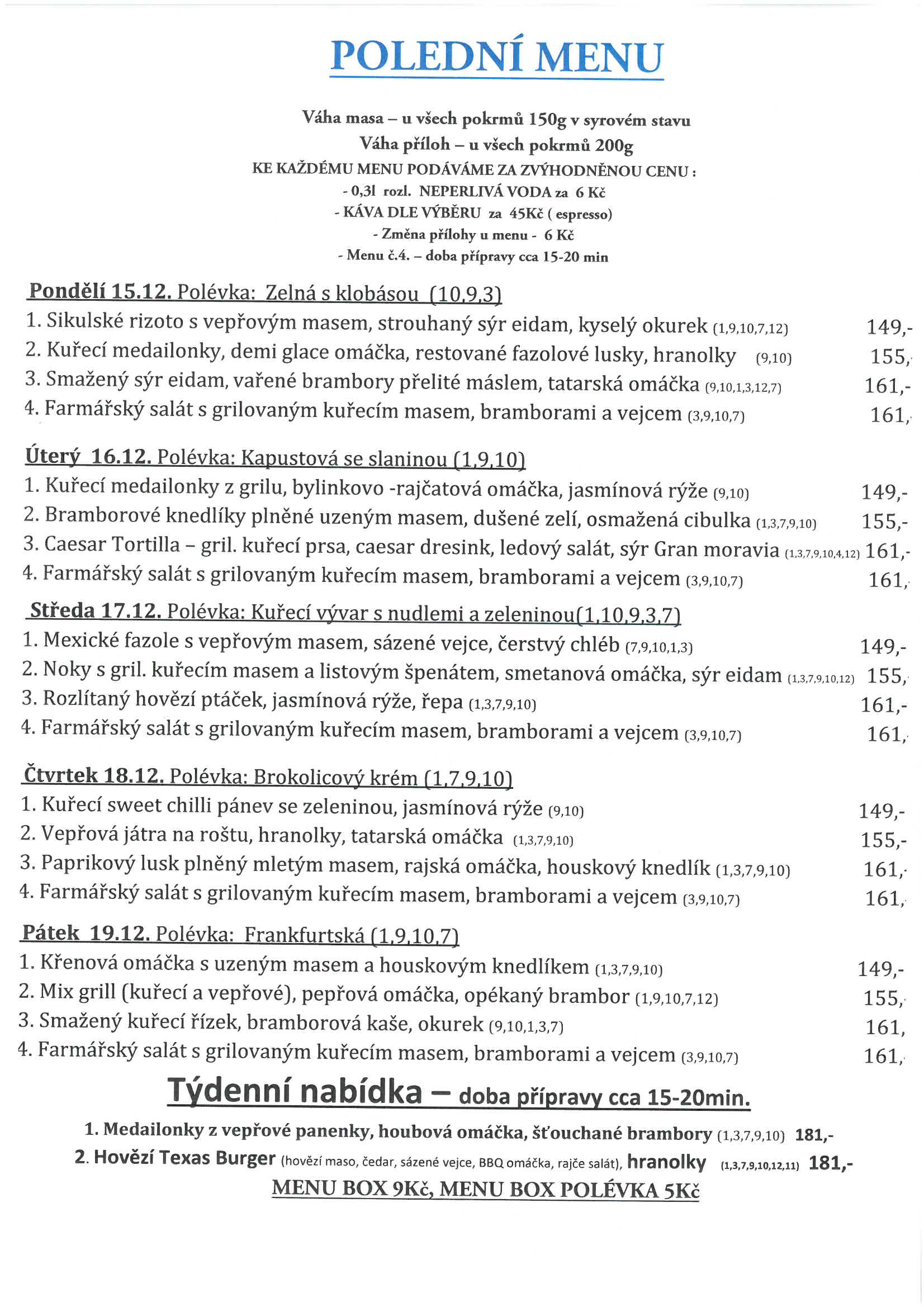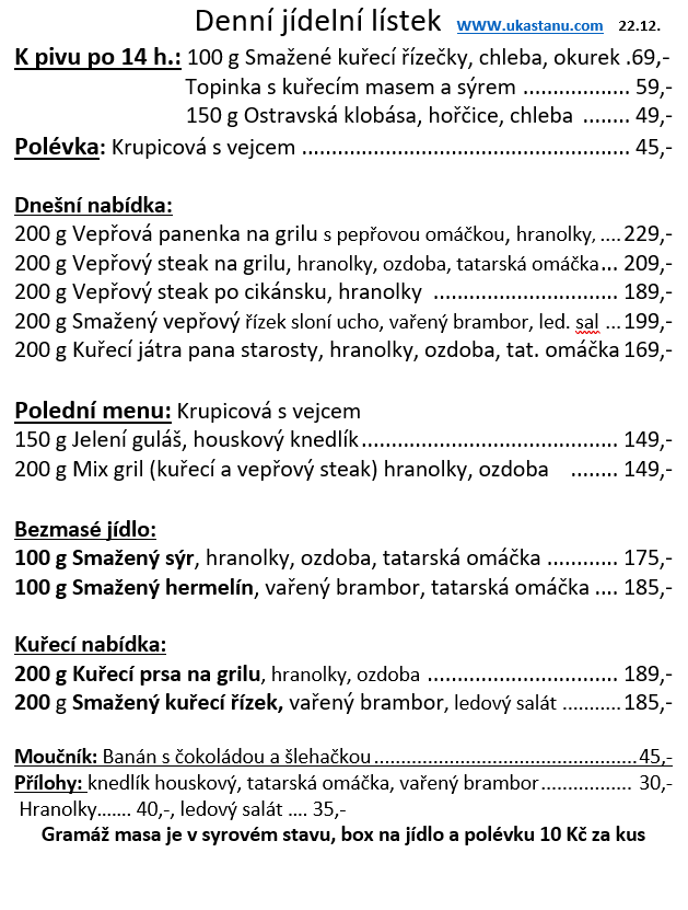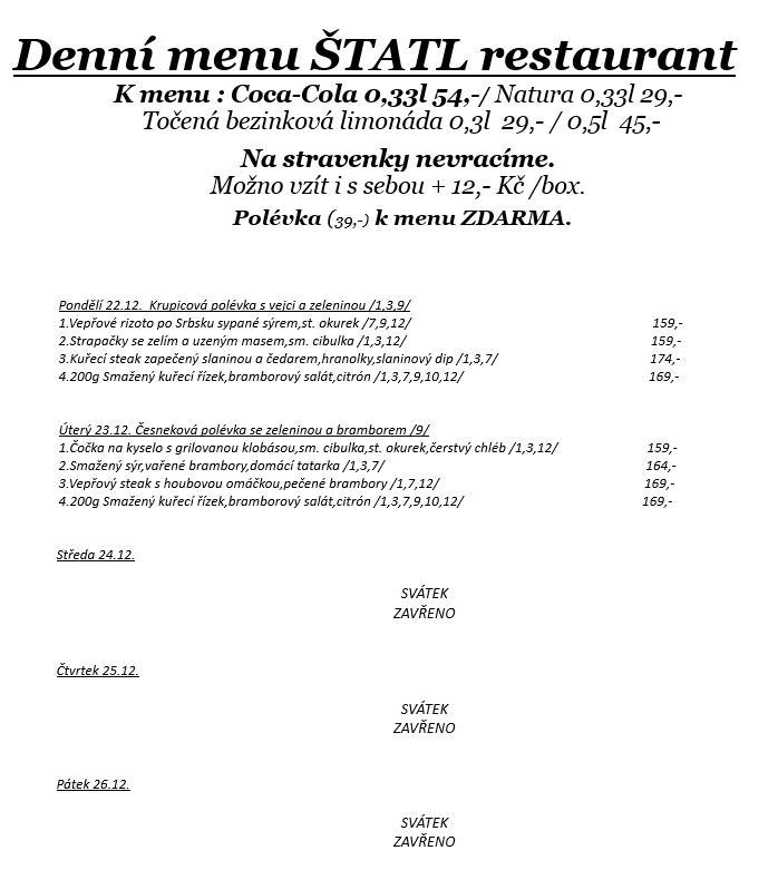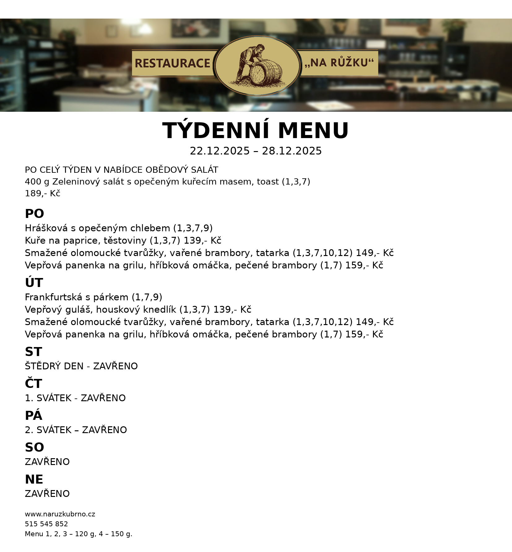 Náš robot zatím neumí automaticky aktualizovat menu této restaurace. Špatný robot! 🤖 Pokud chcete menu této restaurace, kontaktujte je prosím na 📞 777 646 063 a požádejte je o zveřejnění denních menu na lepšímenu.cz. Můžete jim také poslat tento odkaz: https://www.lepsimenu.cz/pro-restaurace
