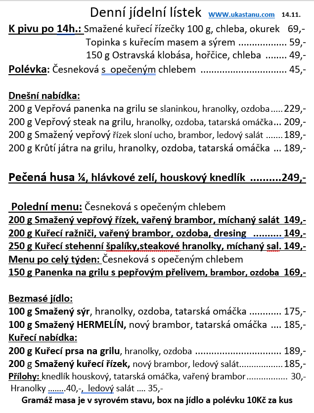Náš robot zatím neumí automaticky aktualizovat menu této restaurace. Špatný robot! 🤖 Pokud chcete menu této restaurace, kontaktujte je prosím na 📞 720660999 nebo 📧 rihacekj@email.cz a požádejte je o zveřejnění denních menu na lepšímenu.cz. Můžete jim také poslat tento odkaz: https://www.lepsimenu.cz/pro-restaurace