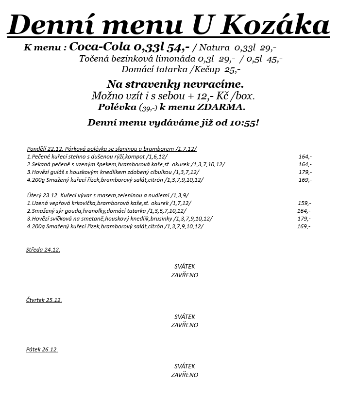 Náš robot zatím neumí automaticky aktualizovat menu této restaurace. Špatný robot! 🤖 Pokud chcete menu této restaurace, kontaktujte je prosím na 📞 511 181 010 nebo 📧 drevenyvlk@gmail.com a požádejte je o zveřejnění denních menu na lepšímenu.cz. Můžete jim také poslat tento odkaz: https://www.lepsimenu.cz/pro-restaurace